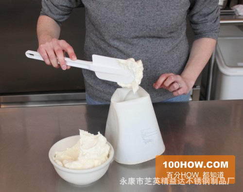 4.用小铲子将结霜挖入管道袋中。装满杯子,其实,它几乎是管道袋容量的一半。这是因为在对花朵展开配管时,您需要将双手放在配管袋上,并且需要留出操纵和抓握的空间。