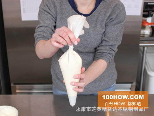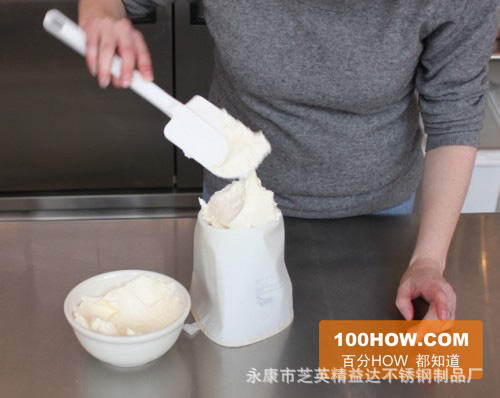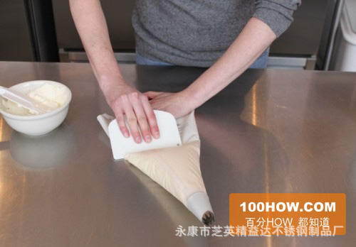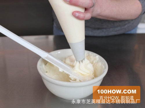 8.如图首先抓住管道花袋,并从碗中挤出一点糖霜,这主要是为了排出剩余的空气。