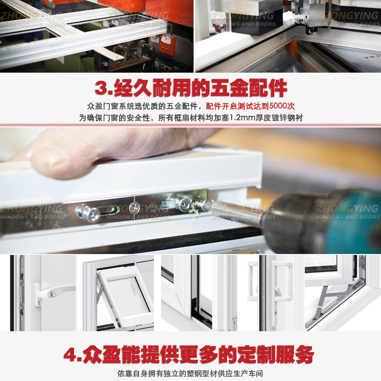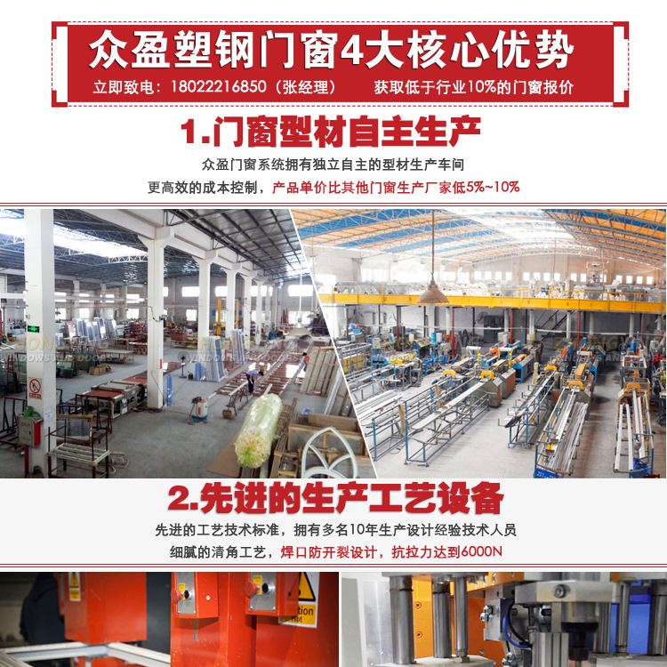 众盈塑钢门窗由1.2毫米厚的镀锌钢衬制成