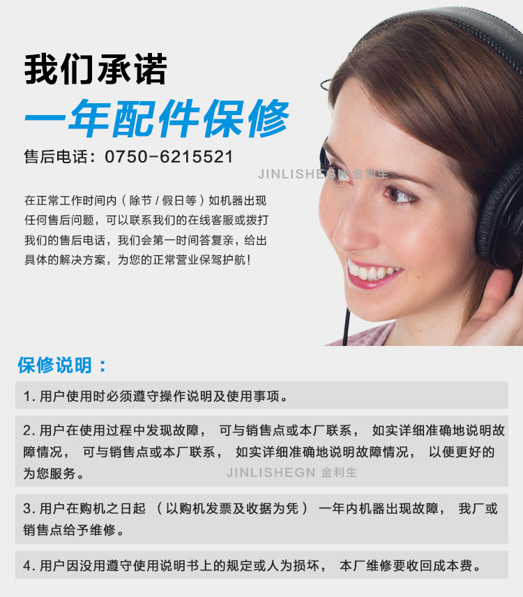 5.一年备件保修:如果自购买之日起一年内机器出现故障(根据购买发票或收据),用户将修整机器。