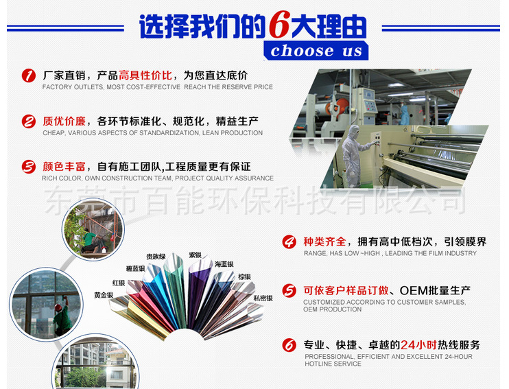 厂家直销,质优价廉,色调充沛,种类完备(银色,蓝色,蓝色,绿银,金色银色,棕银,橙银,黑银色,灰银,茶银,红色,黄色,蓝色,绿色,灰色,黑色,白色装饰膜等),欢迎客户来电咨询,OEM订购。订购前请与客服确认对应的产品,以免出错。