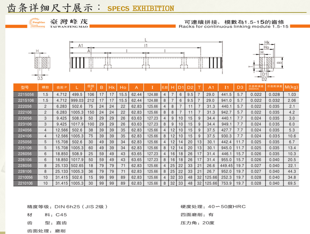 台湾峰茂专门从事精密齿轮,齿条,行星减速机和其他产品的开发和制造。凭借遥遥领先的技术和完整的科学管理体系,它保有滚齿,齿轮成形,齿轮成形,剃毛,齿轮磨削,磨齿等全套制造工艺和测试装置,专业从事各种高等级的研发和生产。精密齿条,v型轨齿条,零背隙滚子齿条,磨齿条,磨齿条,直齿条和斜齿条,精密齿轮,锥齿轮等产品,欢迎新老客户咨询指导。