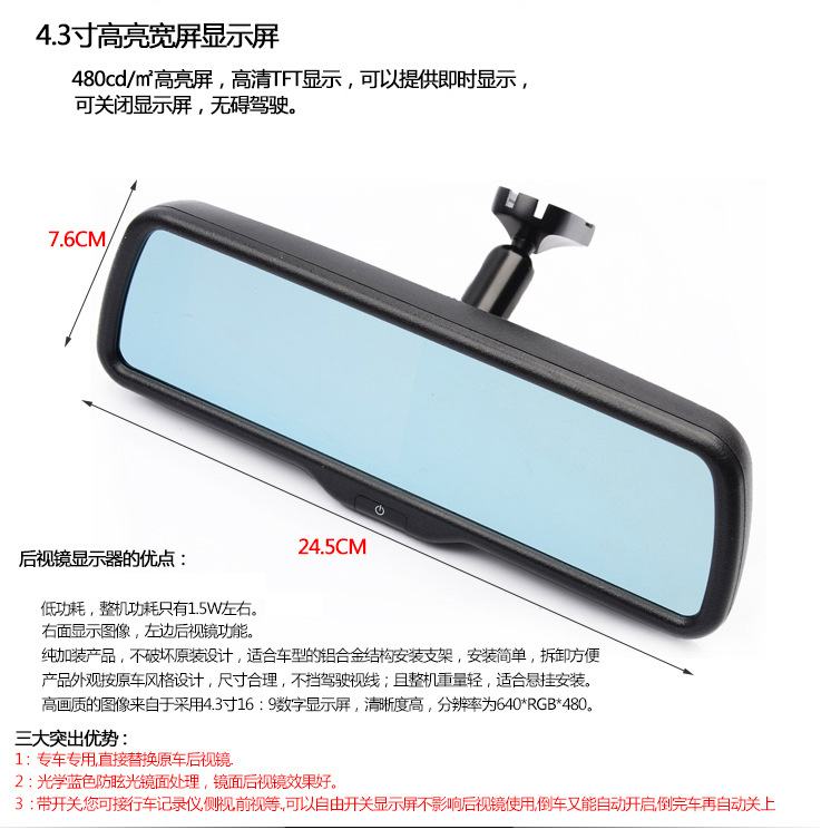 4.使用4.3英寸高亮度液晶显示屏,整机尺码与原车后视镜相同,特别型号可满足专业安装需要,并维持原有风格。