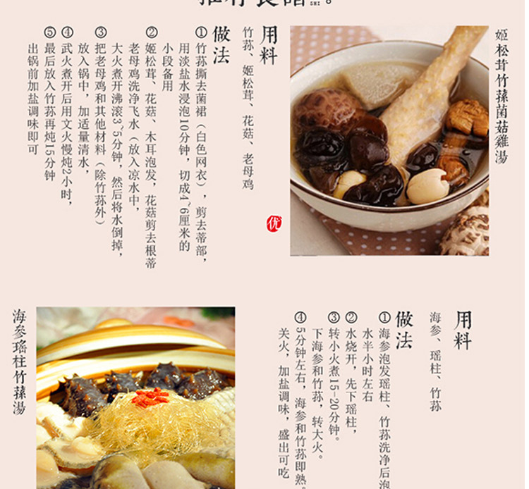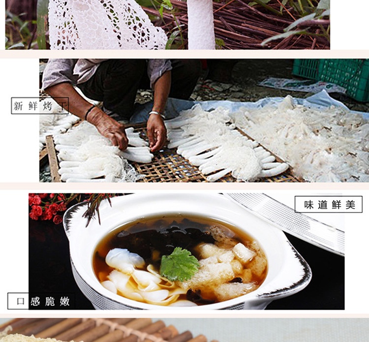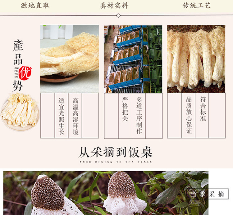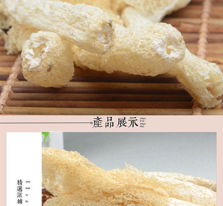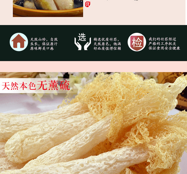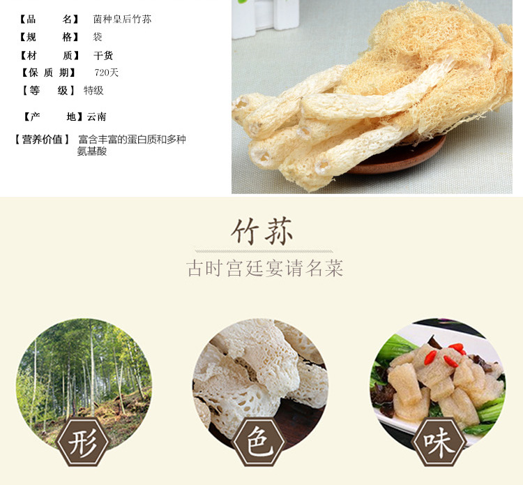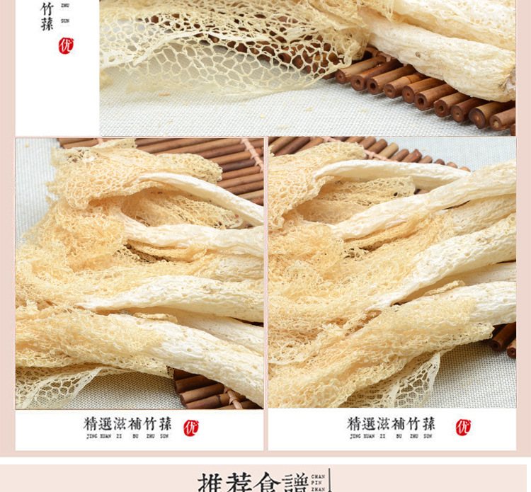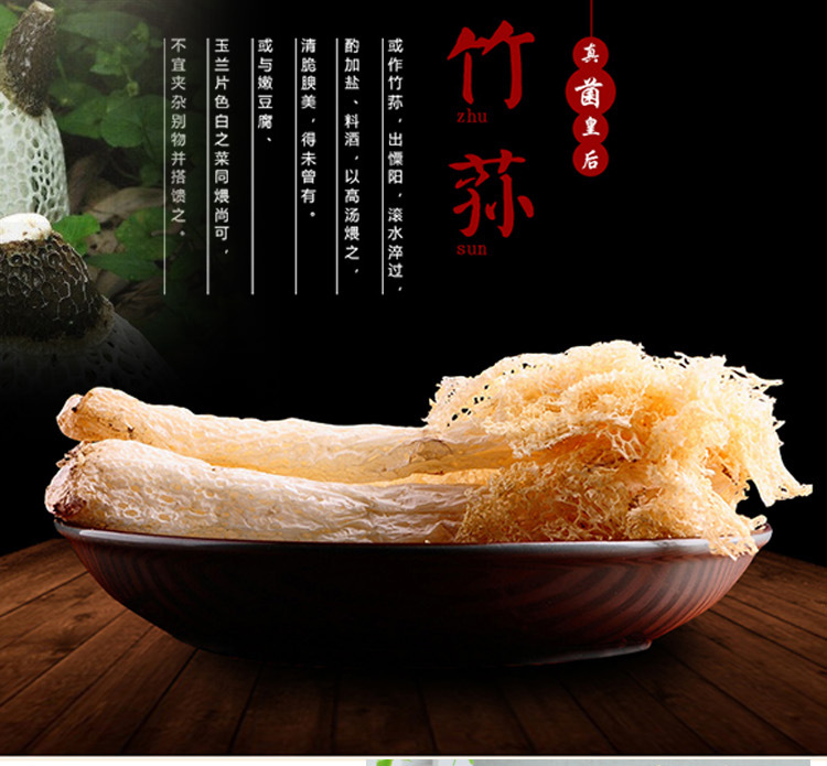产品详情:竹笋(Dictyophoraindusiata (Vent.ex Pers)Fisch)也被叫作竹木耳和竹人参。常见和可食用的品种有4种:长裙竹木耳,短裙竹木耳棘托竹荪和红托竹荪,这是一种隐花菌类寄生在死竹根上的物种。形状类似于干燥的白蛇皮。它有一个深绿色的帽,一个雪白色的圆柱形茎杆,以及茎杆顶部的粉红色蛋形菌托。有一条细白的网状裙子从真菌的覆盖层向下延伸,叫作“雪裙仙女”,“山花”,“真菌花”和“真菌王后”。竹ic蕴含养分,清香醇厚,味道美味。自古就被列为“八种药草”之一。
