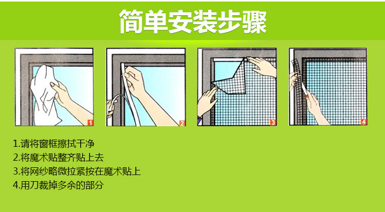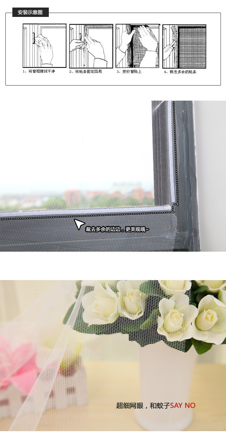 1:可根据窗户的尺寸任意切割防蚊纱网,成为您需要的尺寸,diy方便,适当任何窗户。