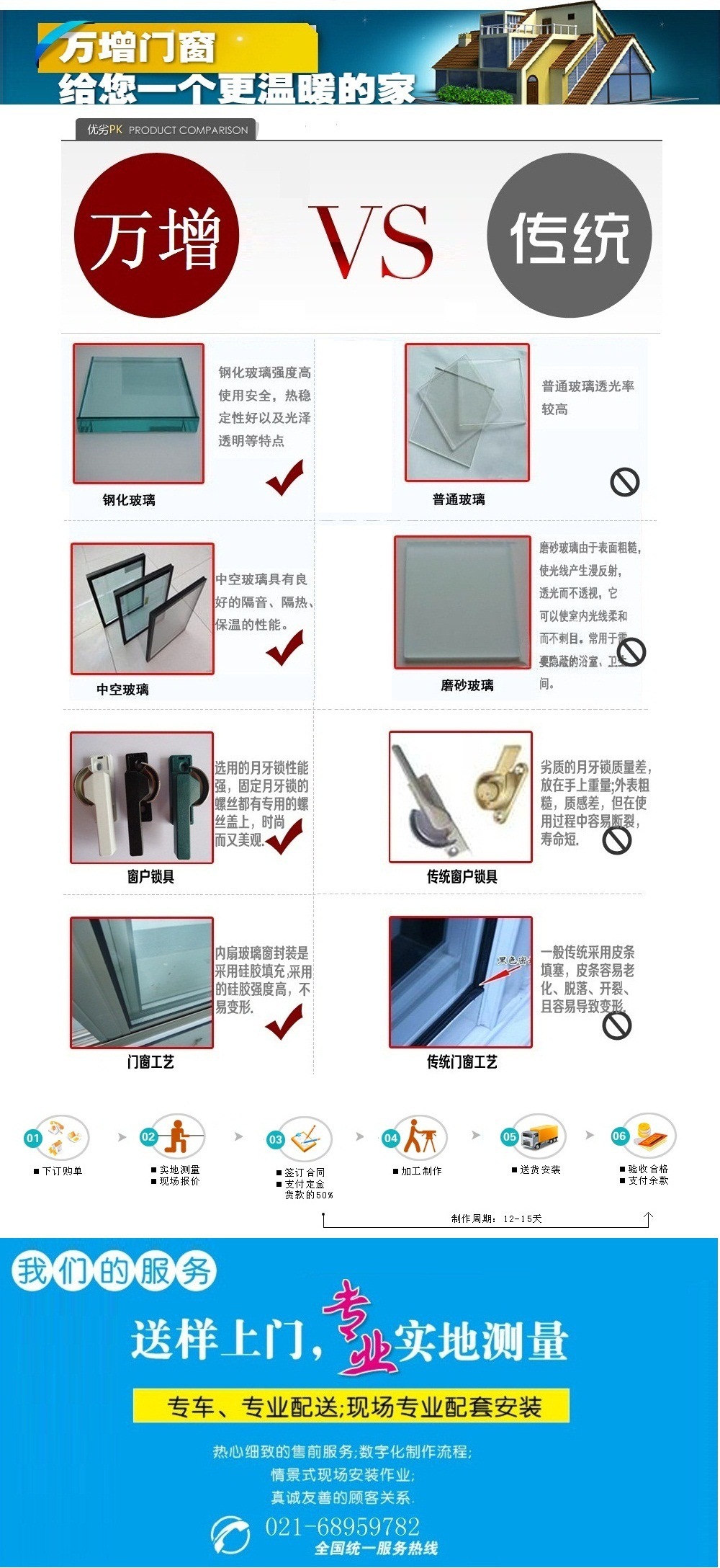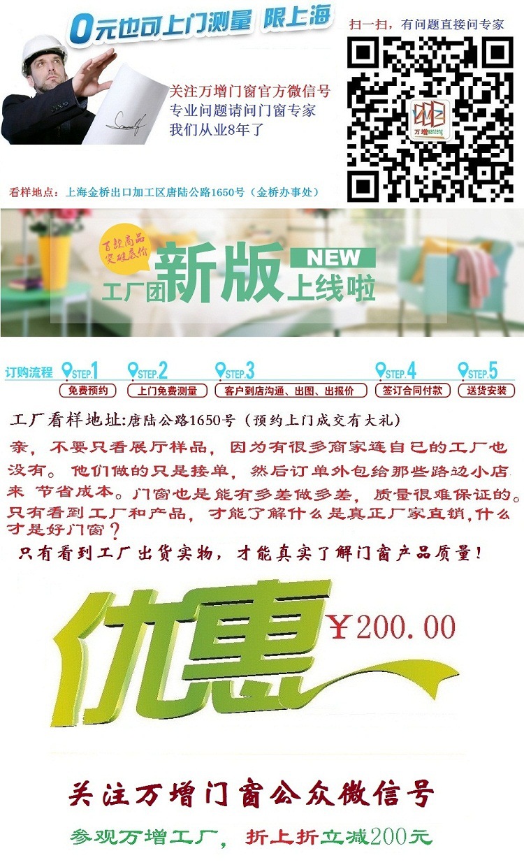 上海万增门窗有限公司的主要产品是美亚宝铝材单玻璃和双玻璃推拉门,侧悬门,推拉窗,侧悬窗,园弧窗,以及各种彩色复合塑料钢门窗。彩色塑料钢门窗的色调可以根据用户要求展开全方位设计,以保证它们在8年内不会褪色。其特征:耐腐蚀,抗老化,稳固结实,安全性好;不须上漆,全年无维护,兼容性好,可与各种构筑物和绿化相配,并形成有意思的对比。它是现代建筑物道路点缀和街景改造中的花蕾。我们公司选项中国最佳的配置文件。随着市场竞争的日渐剧烈,上海万增门窗有限公司为了摆脱低下的市场竞争,不论价格如何,低水平的竞争都会压低价格,因此确信它将开始以品牌和声誉为主导的市场竞争,并坚称“今天的声誉就是明天的市场”。确立企业声誉取决质量和服务。产品质量和售后服务已成为客户选择的最主要标准化。