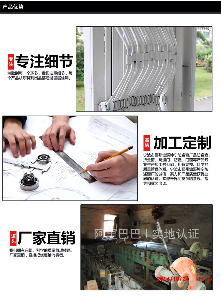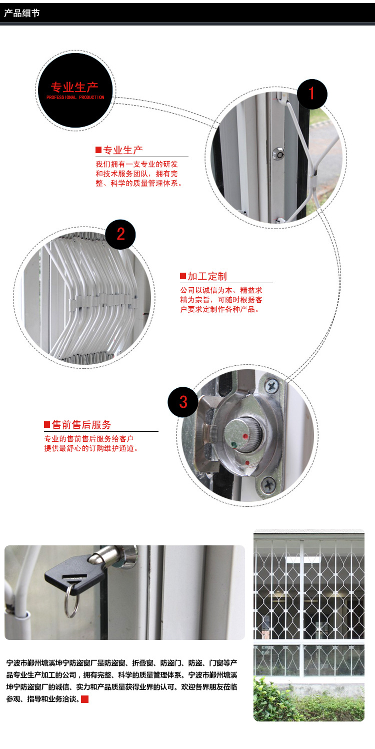 宁波市鄞州塘溪坤宁防盗窗厂是一家专业生产和加工防盗窗,折叠窗,防盗门,防盗窗,门窗等的公司。它具备完整,科学的质量管理体系。宁波市