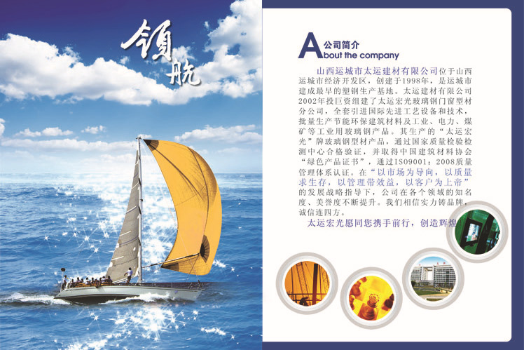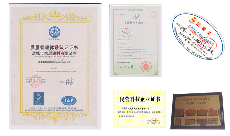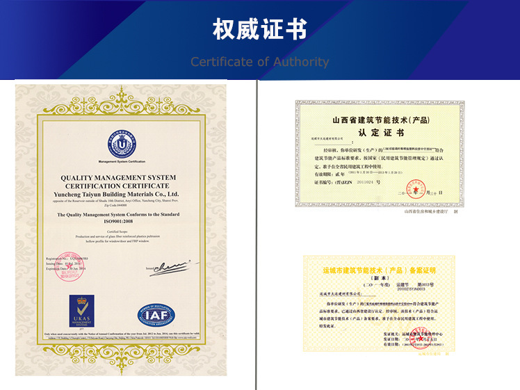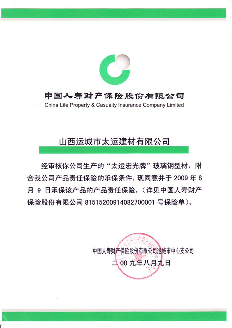 “太运宏光”牌玻璃钢型材产品通过了国家质量检验检测中心的身份认证,赢得了“中国建筑材料协会”绿色产品证书。2004年,通过了“ISO90001:2000”质量管理体系认证;2008年,他们赢得了“山西省建筑物”节能技术产品认证;在2009年,中国人寿财产保险股份有限公司承保了“太运宏光”frp产品的质量。(证书在公司手册中)