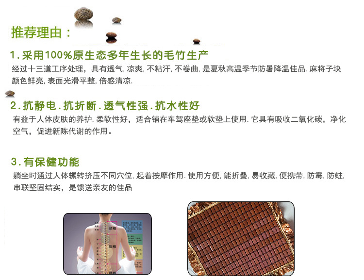 1:由多年栽种的毛竹制成,透气,凉爽,不粘腻,无汗,不卷曲。在夏天和秋天高温时节,它是防范中暑和冷却的好产品。麻将子块色调鲜艳,表面光滑平坦,感觉到凉爽。