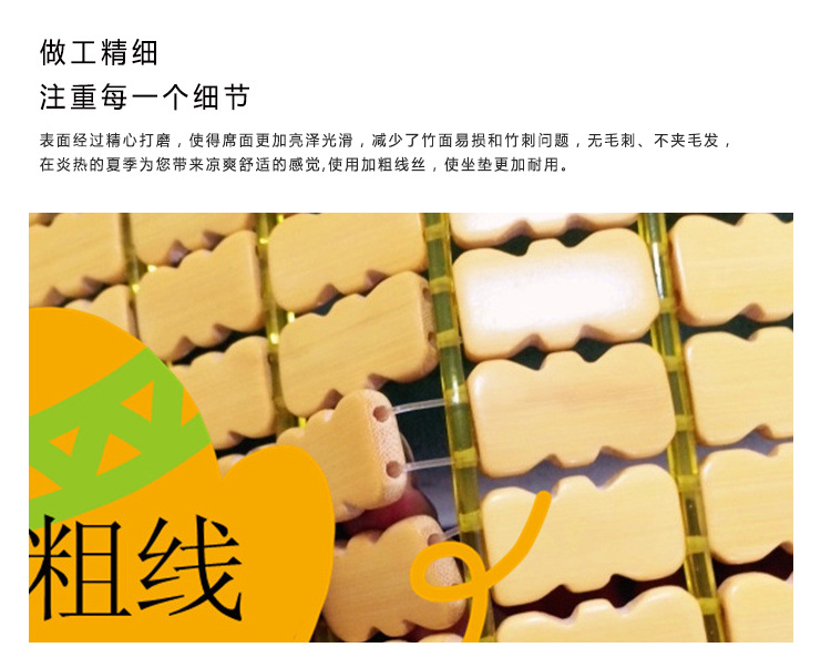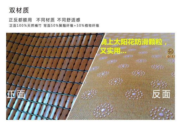 竹凉席从切割竹子,切割材质,折断条,拉丝,蒸制,编织和缝制开始,共有13个工序,所有工序都是手动操作。篾丝蒸煮后,垫子柔软而不柔软易折断,无竹粉虫,边沿严整,颜色美观,编织紧密,经久耐用,并能散热和吸收汗液。