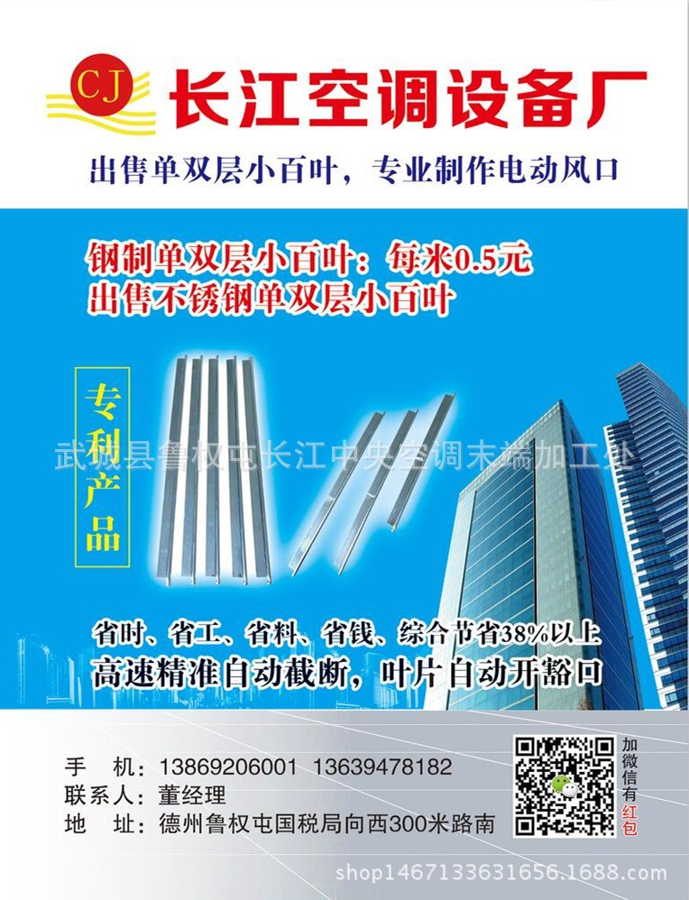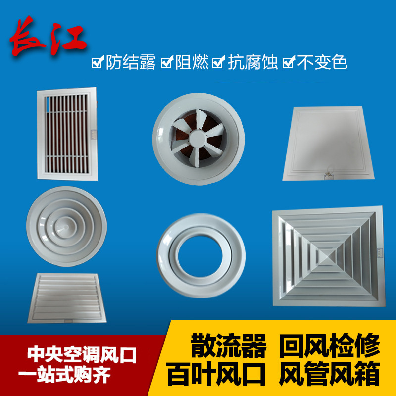 山东长江中央空调终端装置处理座落山东武城鲁权屯工业园。主要产品包括高效出风口,正压出风口,共板法兰风管,铝合金出风口和镀锌普通板法兰管,多叶排气口,多型号空调,新鲜空气设备,风扇,电动通风口,风管,消防阀,调节阀等系列中央空调及终端产品。我厂生产的玻璃钢产品有着创新的设计,精美的材质,严苛的选材,优良的生产,先进的技术,准确的质量,重合同,守信用。公司产品已在全国各地煤矿中经销。,许多化学公司,电力系统公司,办公大楼,商场,实验室,诊所,展览馆,工厂等构筑物的中央空调系统终端装置,并已受到用户的多年好评。