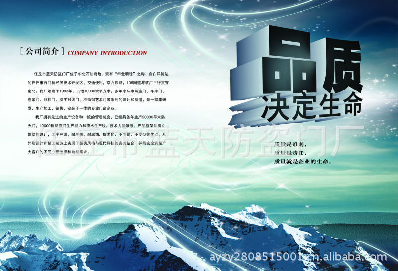 任丘市蓝天门业是一家专业生产非标门,楼宇对讲门,不锈钢门,防火门,防盗门,欧式车库门,管井门和地窖门的企业。生产装置和生产线,技术力量丰厚,管理经验先进。机架使用三维设计,具有耐冲击,耐老化,耐腐蚀,不生锈的优点。经典风格和现代技术的完美结合反映了门的造型技术和实用价值。它在当前门市场上具有独特的风度和超凡脱俗的工艺,内部专业的工艺设计合理,为您量身定制精细制造,以满足特别场合的艺术和功用需求。