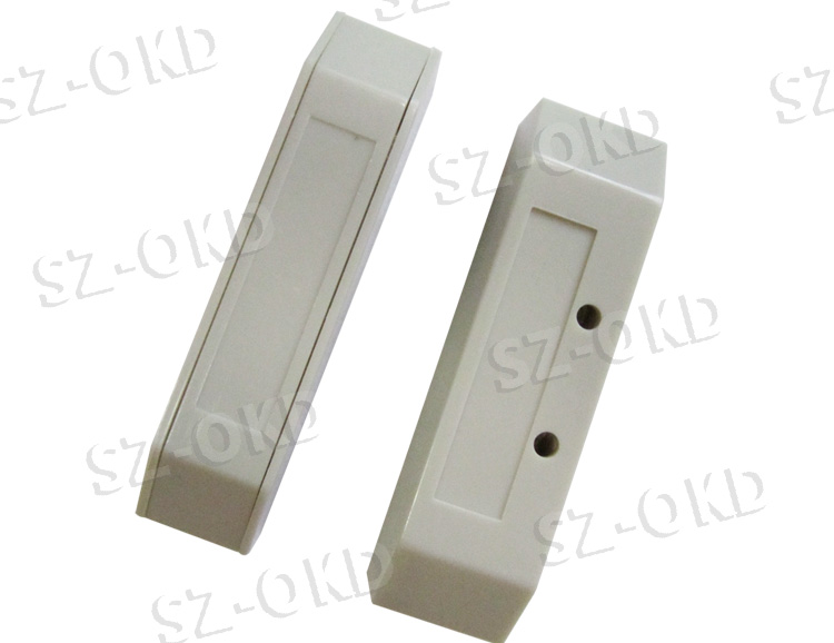 门磁开关主要由开关和磁铁构成。开关部分通过舌簧开关通过导线连接。磁铁部分封装在具相应磁场强度的塑料或合金外壳中,当两者分离或相近一定距离时,会导致开关断开,从而感应到物体位置的变化。