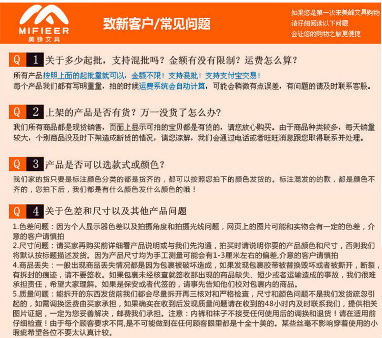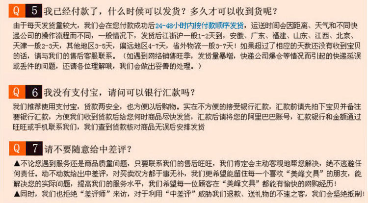 7.快递问题:我们商店协作的快递公司一般而言会在正常时间抵达,有时在特别状况下会在一到两天后抵达,特别是在恶劣的天候和法定假日期间,会有所延期。在各地快递的状况下,周末会有不送货的情形。此外,快递公司每个分支机构的销售人员素质也各不相同。个别商店的销售人员态度也许不好或裹损坏等,卖家无法预期的一些意外因素。无论如何,如果您有任何不愉快之处,请与我们联系,我们将与快递公司积极联系以化解问题。
