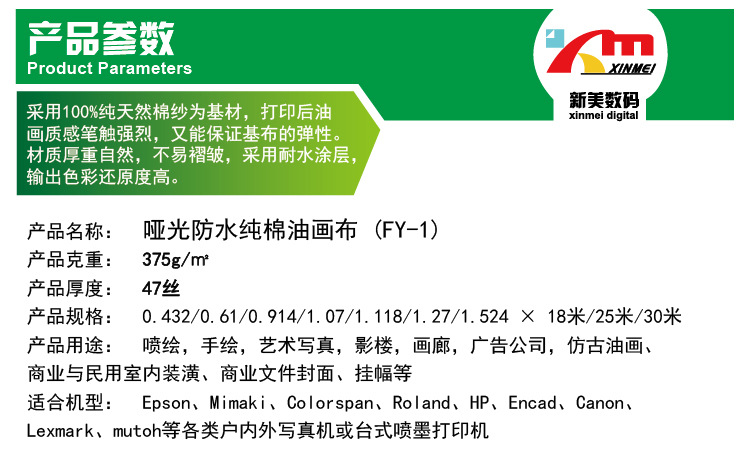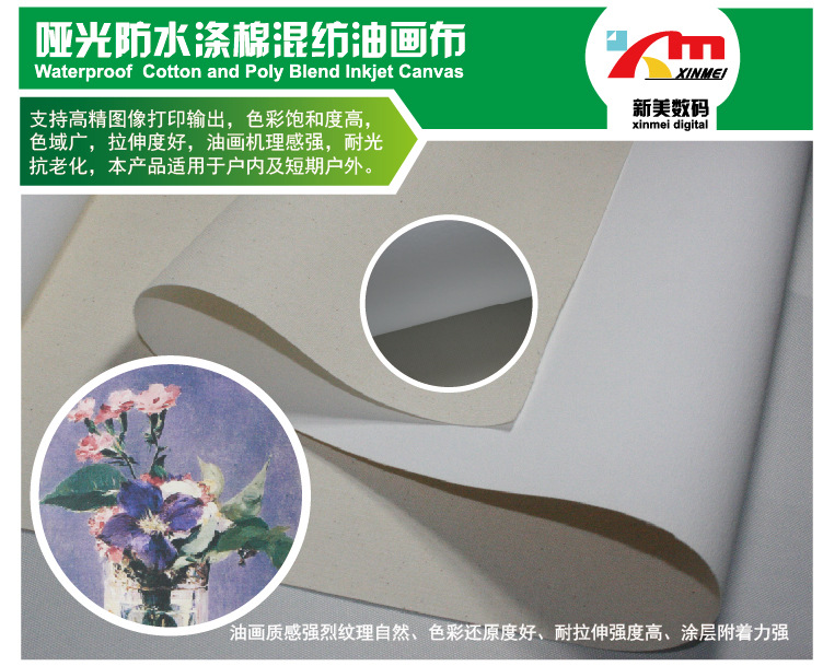 自2003年成立以来,潍坊新美数码喷绘材料有限公司始终独立自主开发和生产化纤帆布,聚酯棉帆布,纯棉帆布,白色美术