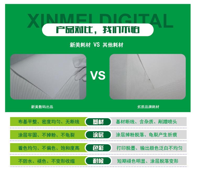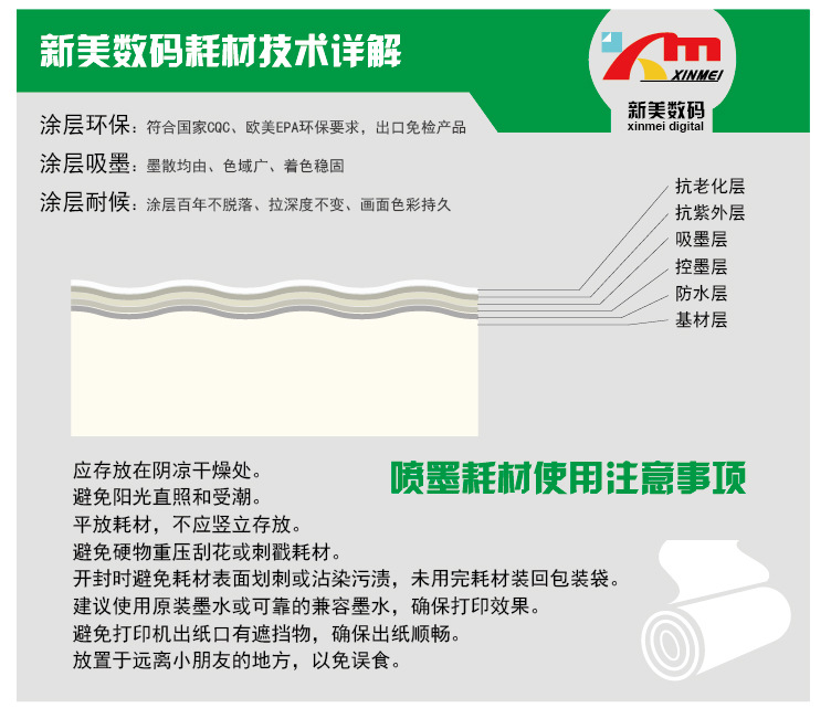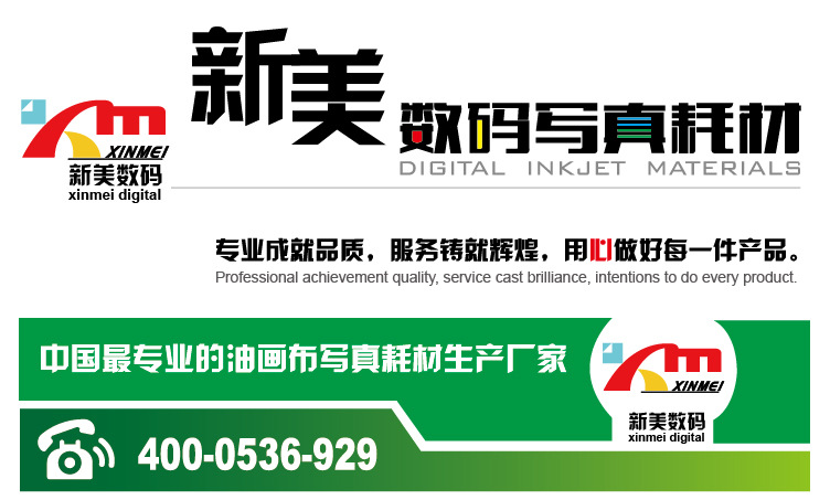 潍坊新美数码喷绘材料有限公司是一家专业生产彩色喷墨打印介质的高科技企业,产品普遍用以广告,影楼,展览布置,艺术品,室内装饰等。@nz生产的彩色喷墨打印介质系列@有着高分辨率,高达2880dpi的色调,绚丽的情调,自然的色条过渡,明晰栩栩如生的图像以及优异的防水,抗老化,抗紫外线等特点。公司具备大量高质量的专业技术公司占地面积2万多平方米,入股500万元,享有自动化的宽幅涂料生产线,产品使用最先进的美国防水彩喷涂技术,质量达到国际程度先进程度。