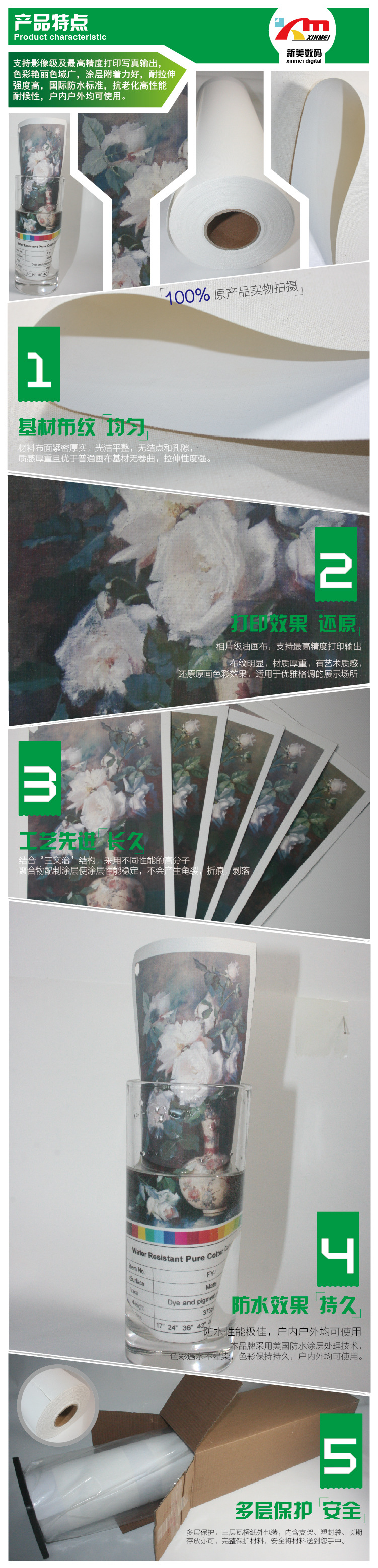 适用于水性油墨和生态溶剂油墨高光泽,哑光,防水,涂层,保色(抗光和抗老化),高精度(化纤600d*600d),室内和室外纯棉,聚酯棉,化纤,无纺布,彩喷布,白色帆布,丝光丝布,德国import墙纸,pppaper(胶粘剂,无胶),适用于高端油画复制品,家庭装饰墙画,高端广告展,无框画,数字油画,金刚石画制作,后期影楼输出,字画,国画模拟,山水画,地理图表,地形图,高端无纺布袋等。公司产品现在已出口美国,欧洲,澳洲和其他发达国家。欢迎定购〜