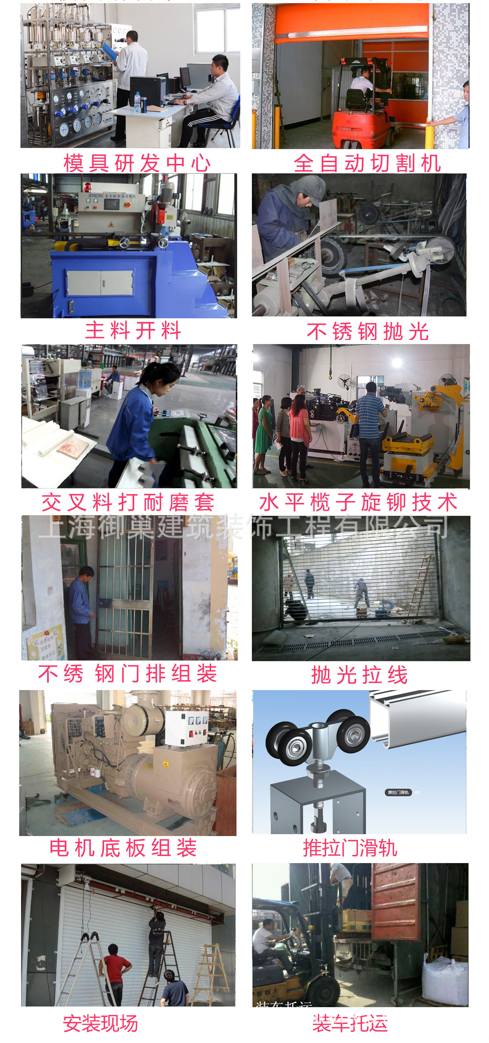 上海御巢建筑装饰工程有限公司是一家专业生产和加工金属门窗,金属原材料及其他产品的公司。上海御巢公司具备型材门生产线,束管生产线和镀锌带生产线,主要生产各种种类的电动遥控型材门,抗风门,网状门,防火门,水晶门,车库门,铝合金门,不锈钢门,感应玻璃门,伸缩门,快速卷帘门,工业滑动门,滑动门和阻碍停车系统及其他产品,批发和零售卷帘门材质及配件。