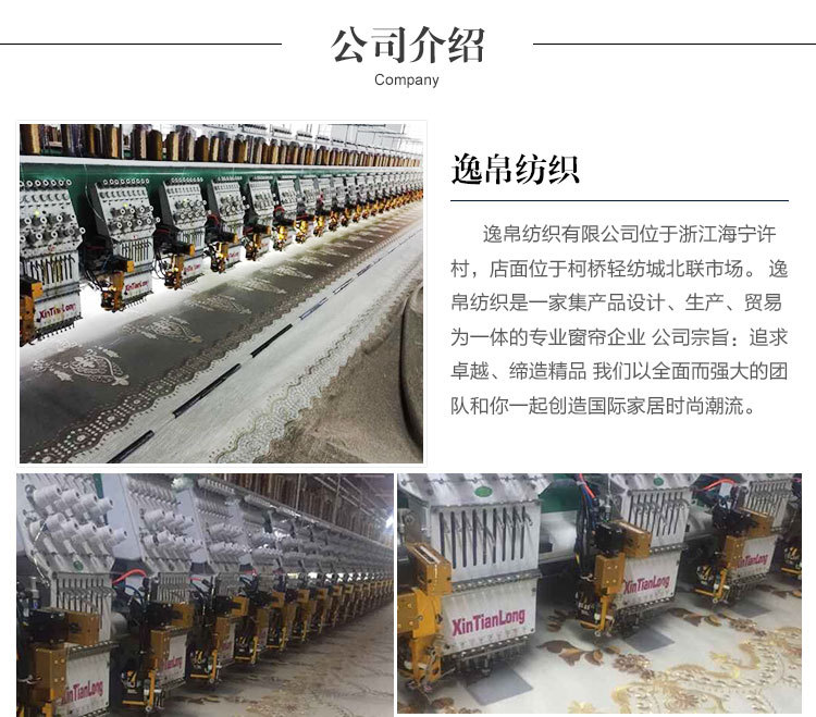 逸帛纺织有限公司坐落浙江海宁许村,商家座落柯桥轻纺城北联市场。逸帛纺织是一家集产品设计,生产和贸易于一体的专业窗帘企业。公司的主旨:追求卓著,创造优质产品。我们将具备一支强劲而全盘的团队,以创造国际家居时尚潮流。