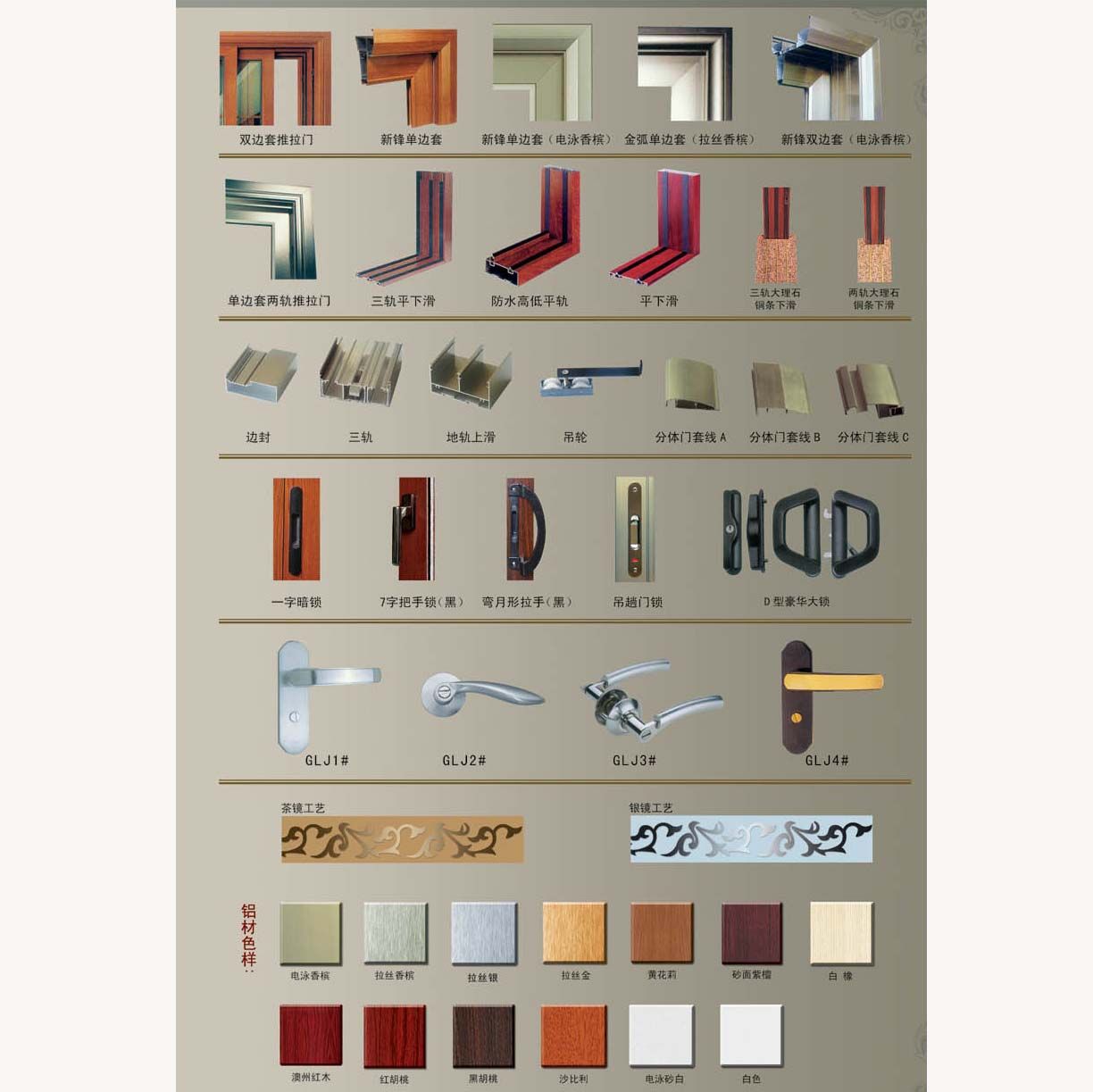 一:铝合金表面处理:粉体常规喷涂,正极氧化喷涂,氟碳喷涂,电泳喷涂,可确保十次以上不褪色。仿木纹变色质感。