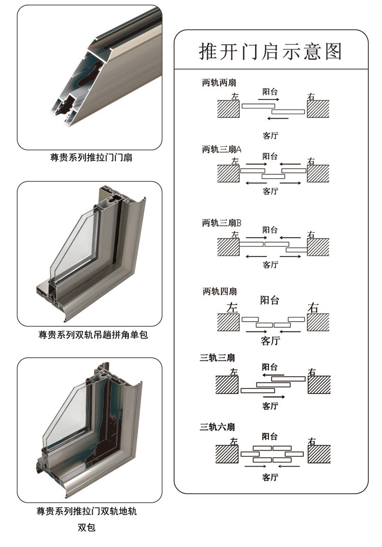 宽广的门扇具备较大的打开范围,使客厅享有更多的照明和更多的空间。地面无障碍轨道的与众不同设计,无障碍物进入;上悬挂轮使用高强度优质滑轮,可自由,宁静,稳定地滑动,开启和关闭时几乎从未噪音。经过我们研发机构的一次实验测试,滑轮一般而言可以推拉最多100,000次。门扇新颖美丽,在一个小城市客厅里是一道亮丽的景致,使您赏心悦目。