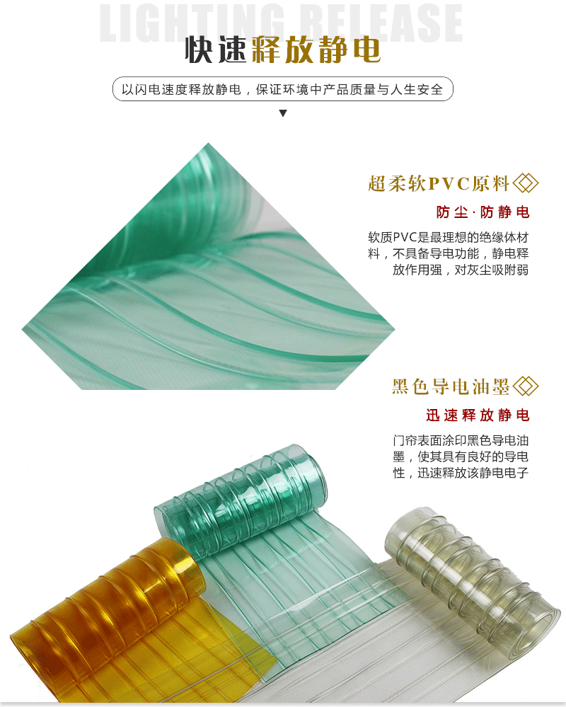 防静电门帘柔软,透明,防尘,防静电,对行人免费。它们普遍用以电子工厂,钟表,食品,制药,制冷和其他行业。它们特别适宜电子行业中的净化车间和无尘车间。,黑色导电油墨以不错的抗静电功效印刷在PVC薄膜上,从而使产品网格具不错的导电性。