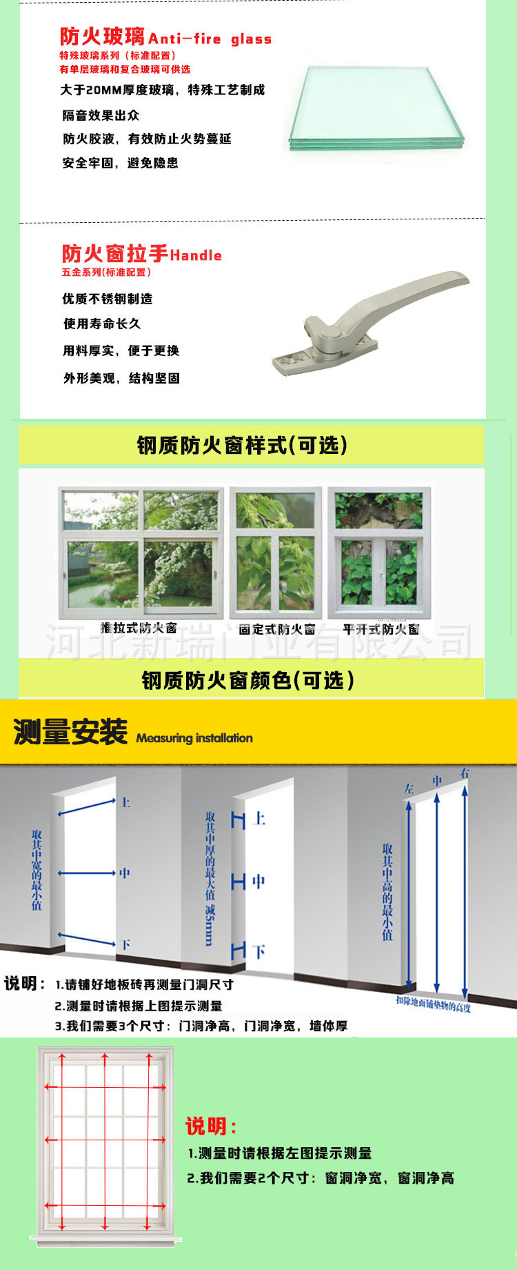 (2)安装防火窗时,必须用水平尺将其指向水准,或者必须用吊线的方式校正前后左右的垂直度,以使横平,垂直,高度为相同。
