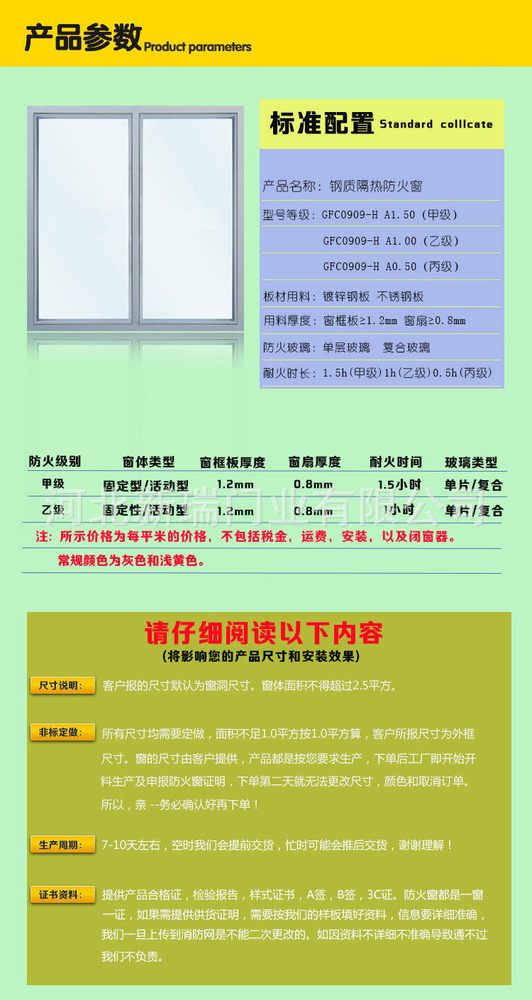 a级窗不少于1.5小时,b级窗不少于1小时,c级窗不少于0.5小时,以最新规格GB16809-2008火窗为准。