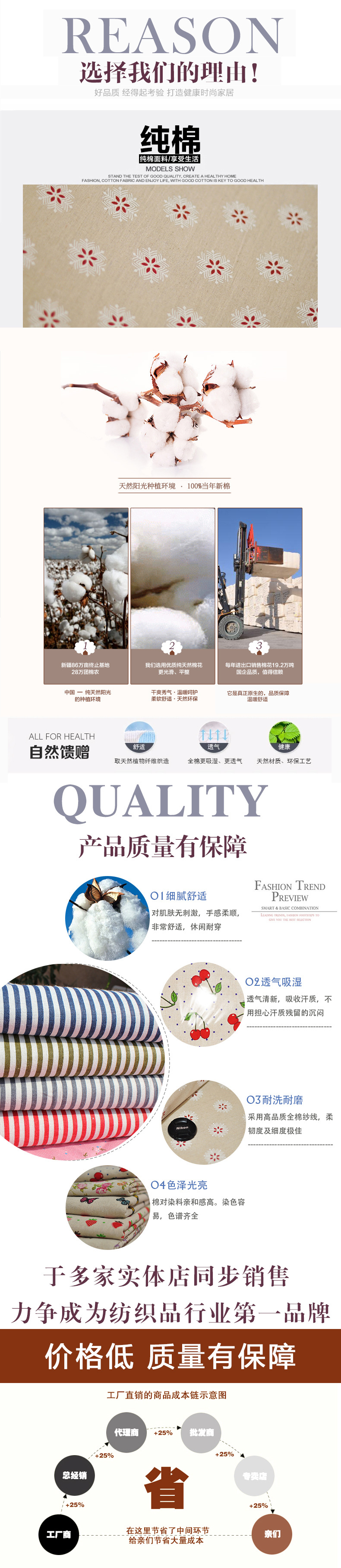 山东临沂雨晨棉麻布料厂有限公司专业从事棉麻印花,棉麻印花,棉麻印花,亚麻麻印花,涤纶亚麻麻印花产品,印染加工已有46年之久,主要经营各种窄幅,宽幅,纯棉,poly/棉,纱布,亚麻布,涤卡,纱布,帆布以及各种染色布,柳条,衬里特种布。公司的国内客户主要针对主要用品制造商和家用纺织面料制造商。同时,它每年大量出口。同时与许多实体店同时销售,遥遥领先于纺织工业。