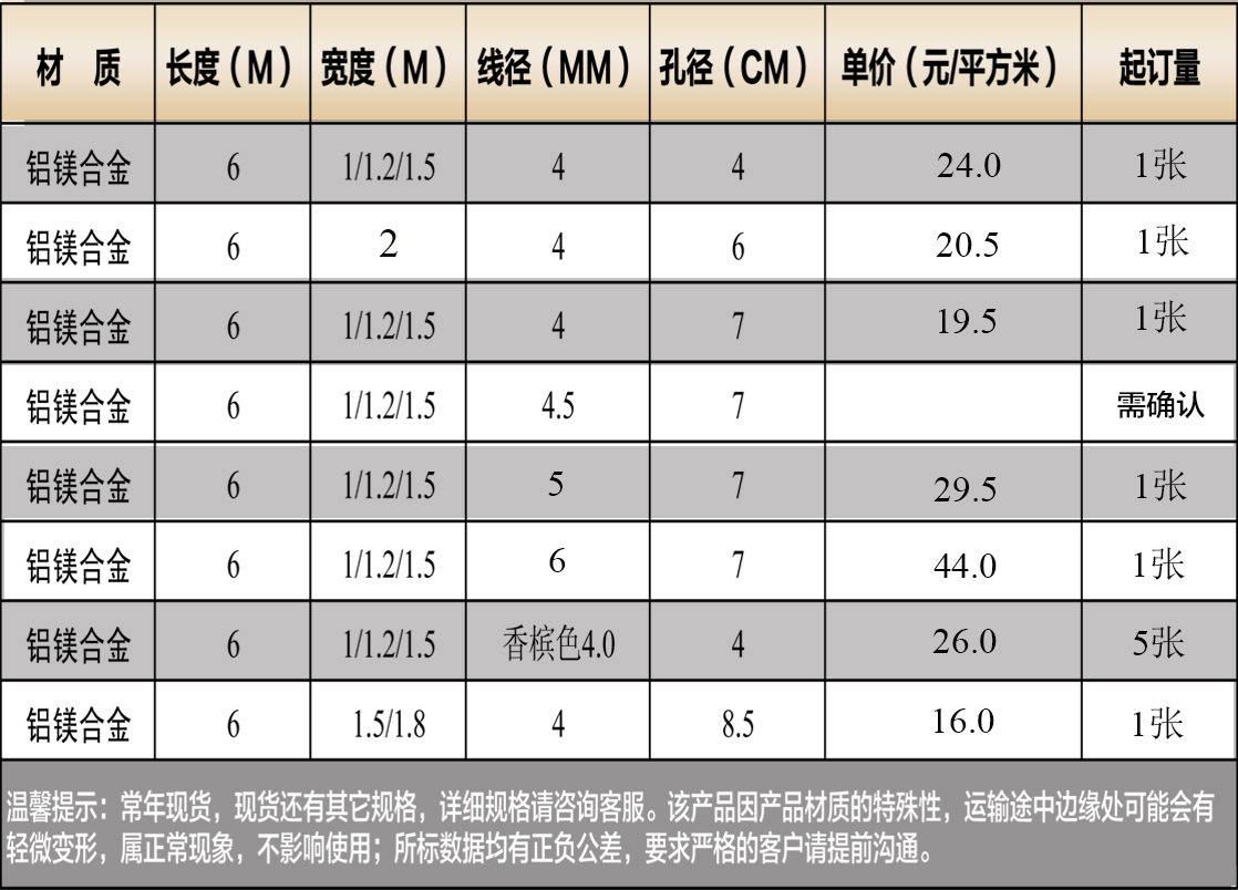 产品用途:我厂生产的铝网系列,孔眼强,用到寿命长,用途普遍。它主要用以民用建筑物,机器装置保护,住宅窗子维护,手工艺品制造和高档音箱网罩。高速公路护栏,运动场围栏,道路绿化带防护网。