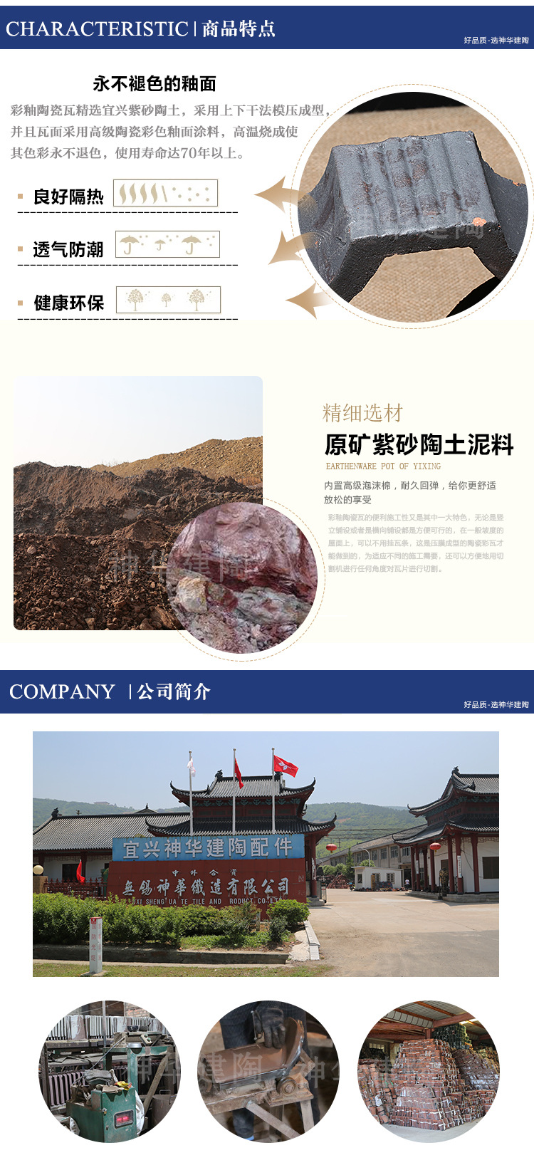 宜兴市神华建陶有限公司座落中国陶瓷之都江苏宜兴,是一家专业制造,开发和销售琉璃瓦,外墙劈裂砖,彩色粘土方砖,陶瓷栏杆