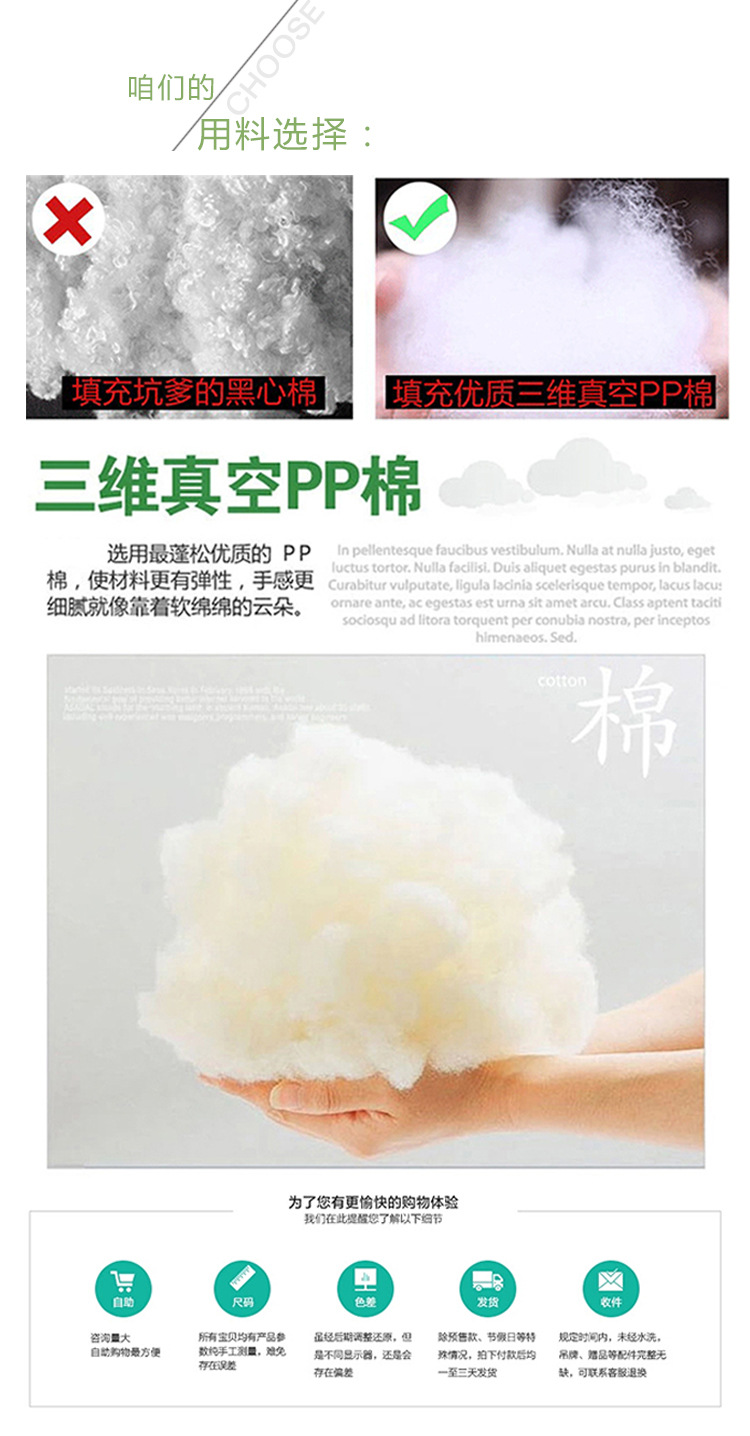 PP棉枕芯:枕套是一种防羽绒布,内含三维空心高弹力PP棉,环保,安全,蓬松,枕芯的尺寸一般而言比枕套大5cm。保证充分填充功效!45cm枕套和50cm枕芯。
