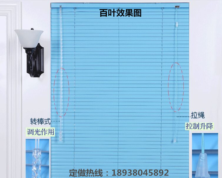百叶窗由上滑轨,叶片,下滑轨,装饰件,梯形皮带,旋转杆和拉绳等构成。