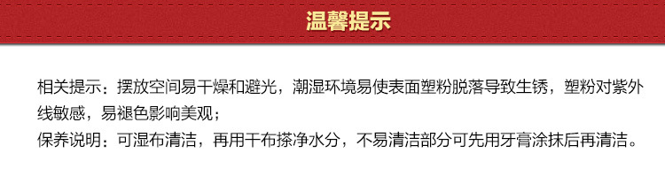 9.相关提示:存放空间易于干燥且避光,湿润的环境可能会引致表面的塑料粉落下并生锈。塑料粉对紫外光敏感,易于褪色并影响外观;