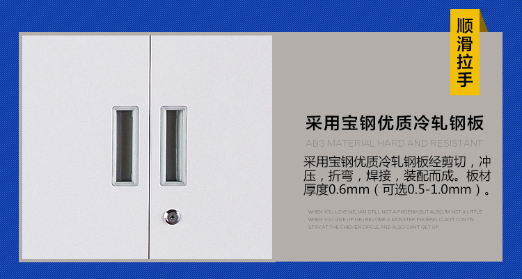 2.储物柜柜体表面喷有新西兰import混合型热固性粉沫,耐高温,防静电