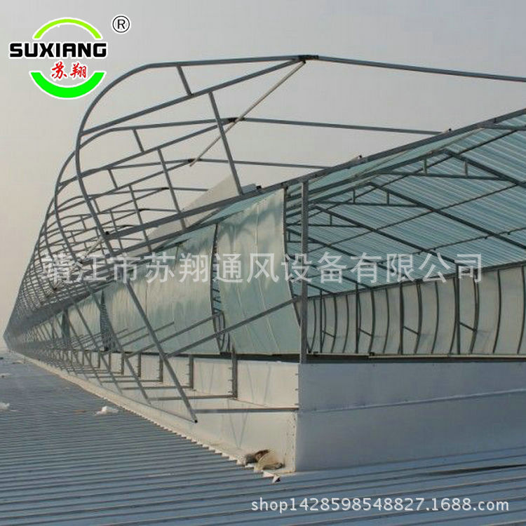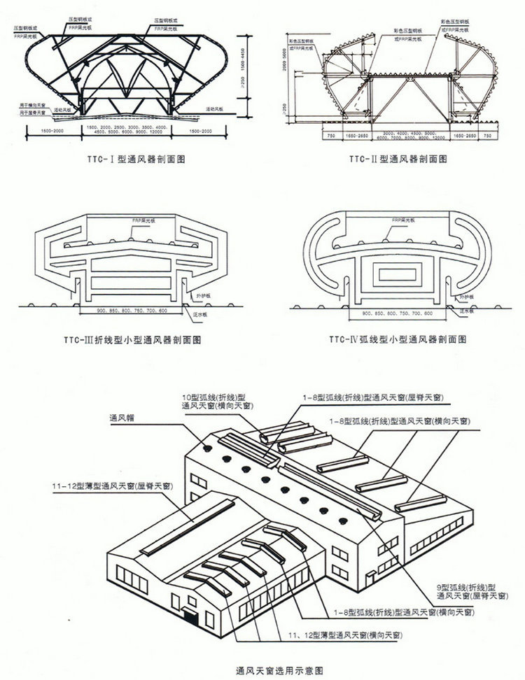 2.TTC启闭式弧线型屋顶通风器由外围防护板,框架,防雨罩(导流板),执行器,水槽,落水管,阀板,传动机构,挡水板和连接板等构成。