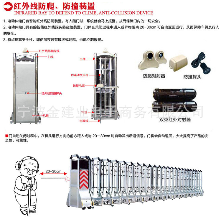 防爬报警:配置红外防爬检测系统,当门处于关闭状态时,智能红外防爬信号有效性输出报警信号,智能红外感应障碍物。此时,控制箱中的警报会发出警报:警报时间为10秒,可以通过控制箱控制器或打开门将其停止