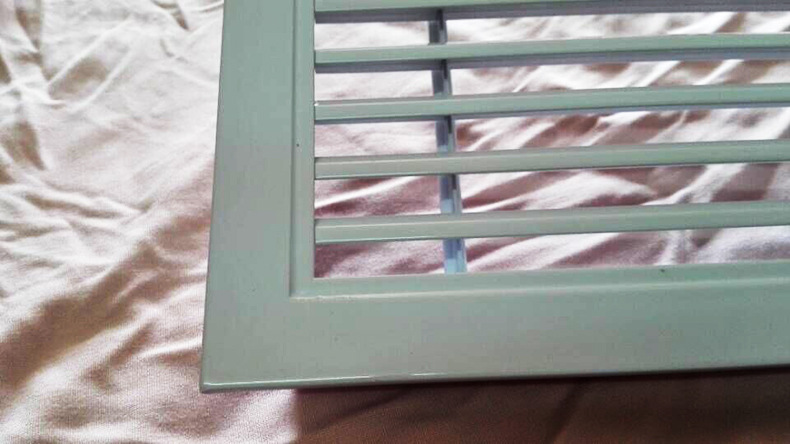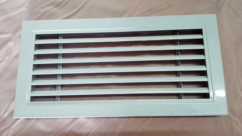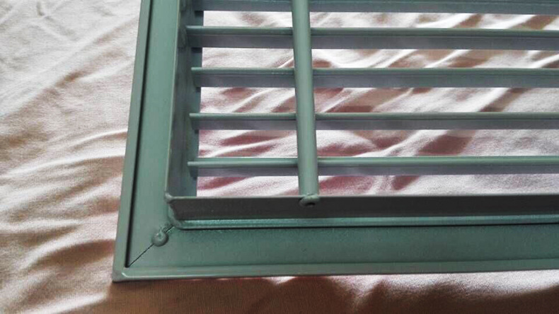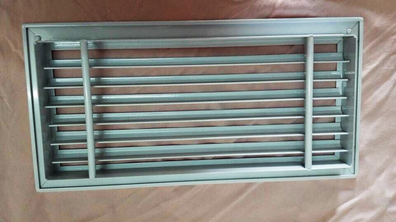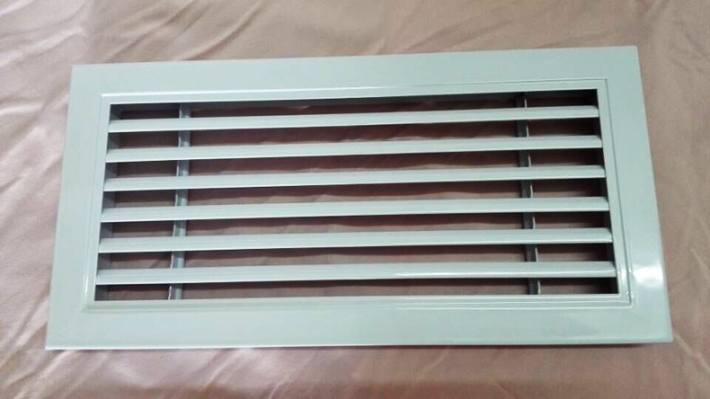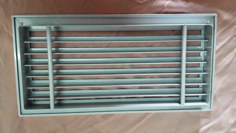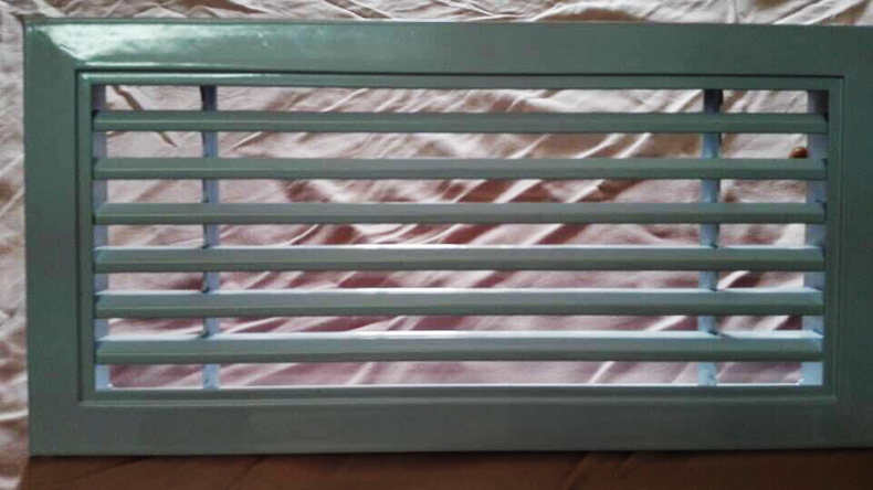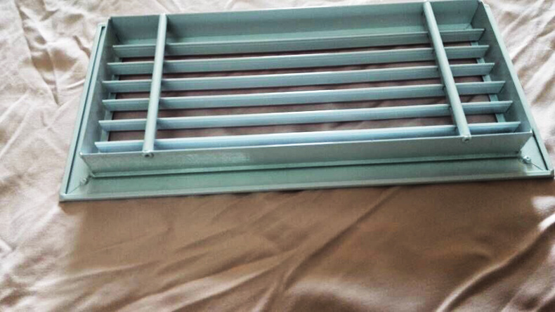 百叶风口一般而言用以管道中的抽吸和空气供应。同时,可根据实际上状况装设人字形水闸(多叶开关调节阀)。百叶窗式风口用以操纵风量或安装铝合金过滤器以供配套使用。叶片可分成程度和垂直两种。百叶窗可灵巧地左右旋转或上下旋转以支配气流方向。单层百叶窗:1.单层可调叶片可获得不同的送风相距和不同的扩散角2.可当作空气送风口和回风口3.可以选项铝或塑料钢。4.调节阀与5.结合使用。当它是回风口时,可以做成开放式构造,并与过滤器结合使用。