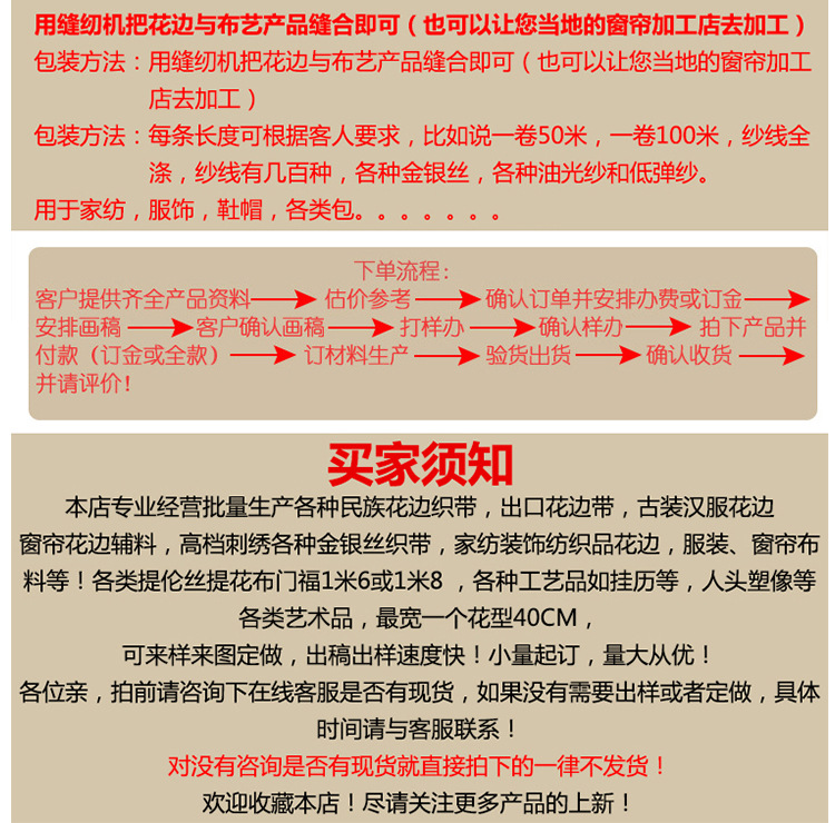 礼品,玩具等装饰花边,箱包,床罩,毛巾,手套等家用纺织品配件,我公司有进口机器和
