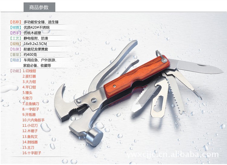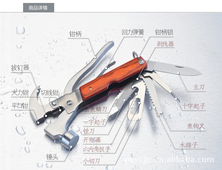 [主要工具]老虎钳,剪线钳,锤子,刀,十字螺丝刀,锯,锯齿刀,一字螺丝刀,锉刀,开瓶器等功用合而为一。