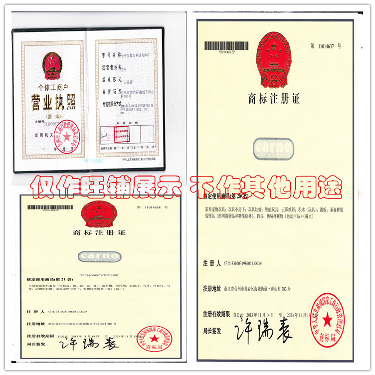 台州市黄岩利青塑料厂成立于2011年,是一家集生产,加工和销售于一体的私营企业。该公司坐落浙江省台州市。其品牌为“carno”卡诺宠物日用品。我们的产品包含宠物必需品,玩具和食品器械。目前,我们致力于开发各种宠物产品,例如猫,狗,仓鼠和兔子,以满足国内外客户的需求。现在我们有各种基准和形状的产品,我们将使它们更丰富,更完整。我们产品的优势在于它们的质量高,价位低。长期以来,公司坚称高标准,严苛的质量政策,标准的生产,诚信的管理,取得了客户的一致好评。