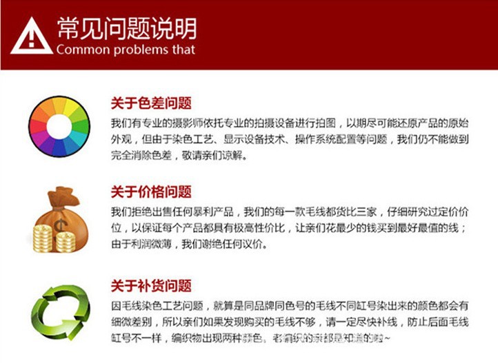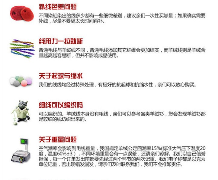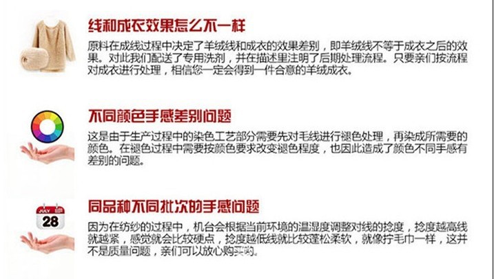产品详情:留意:在我们银行购得的所有纱线在生产前须要展开针织或染色。如果有任何质量疑问,须要在接到货物后的七天内向我们的银行送交书面报告。只退还羊毛,不退还毛衣,如果购买者采用大量的半成品或半成品,银行将不肩负任何义务