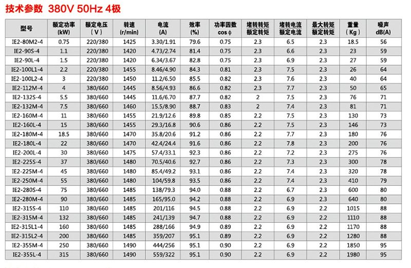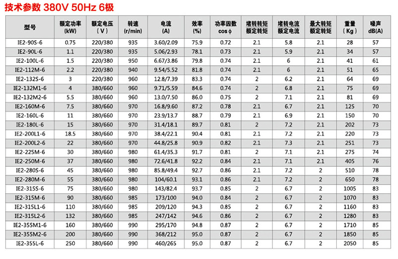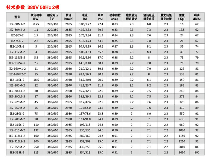 YE2系列高效节能电机50hz,60hz,1000v以下,S1工作系统,2P,4P,6P机架号为h80〜355,功率范围为0.18的电机KW一625kW功率范围广,是最完美的能效等级产品,电动机可普遍用于各种传动机械行业,例如抽水机,风扇,机床,减速机,包装机械,矿山机械,建筑物机械等。
