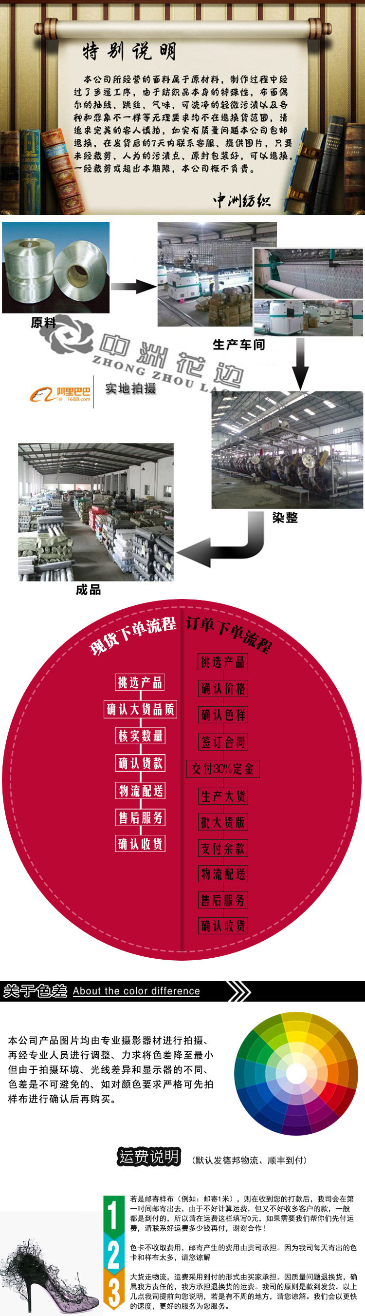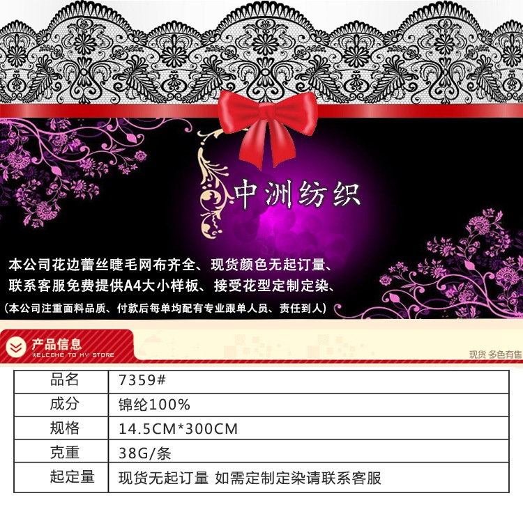 产品详情:该公司专注于蕾丝面料,兼具特别功用的蕾丝面料,睫毛,蕾丝,定位花,网眼等,产品齐备,图案多样,无法逐个上传。如果在店铺中找不到所需的图案,请关系客服人员为您服务。我们将竭力满足您!