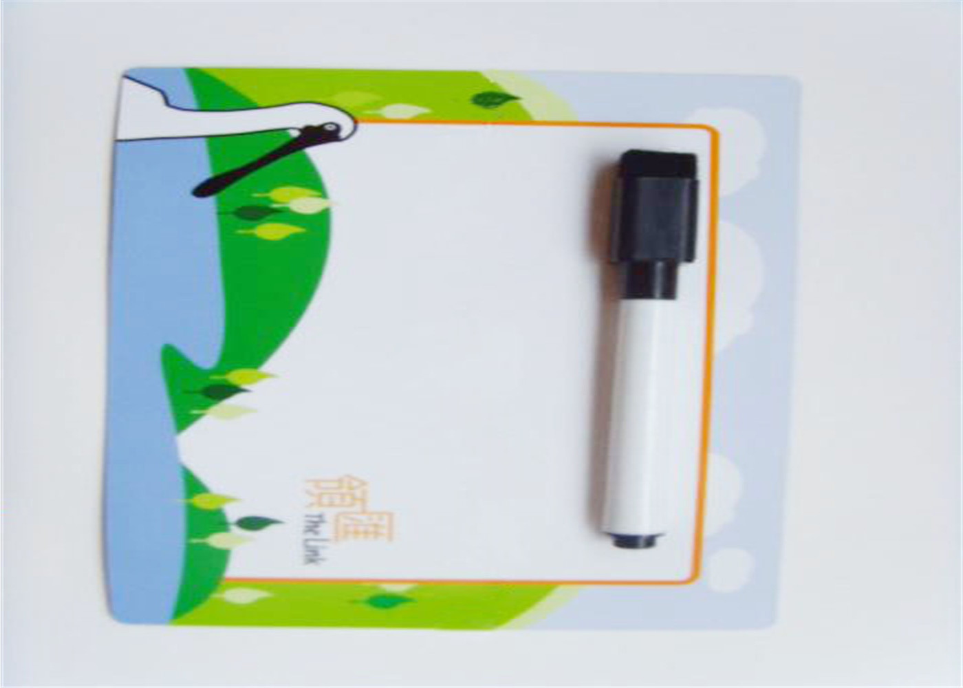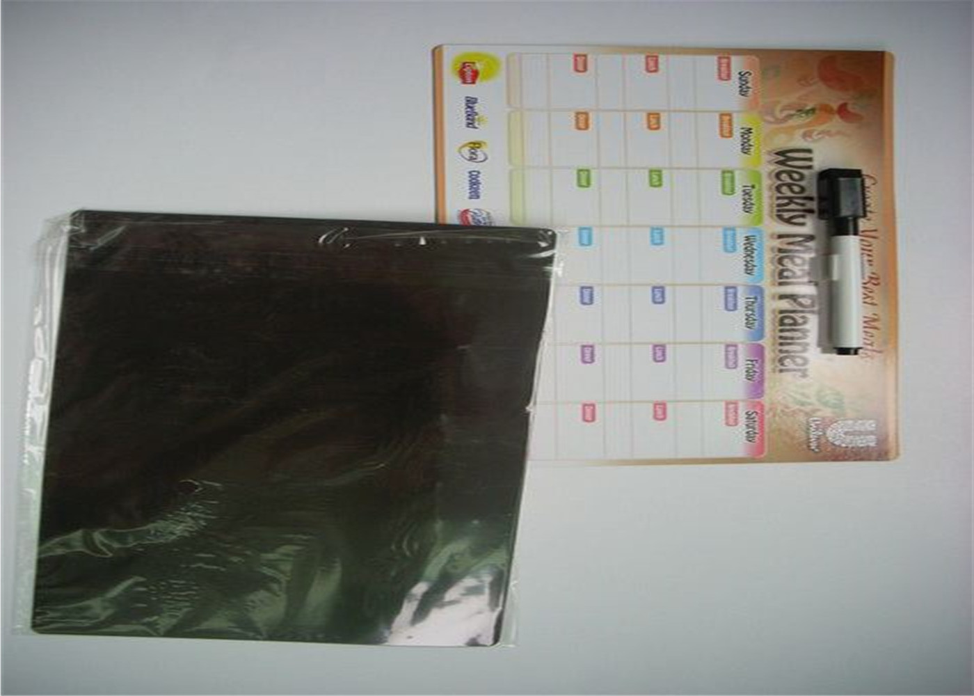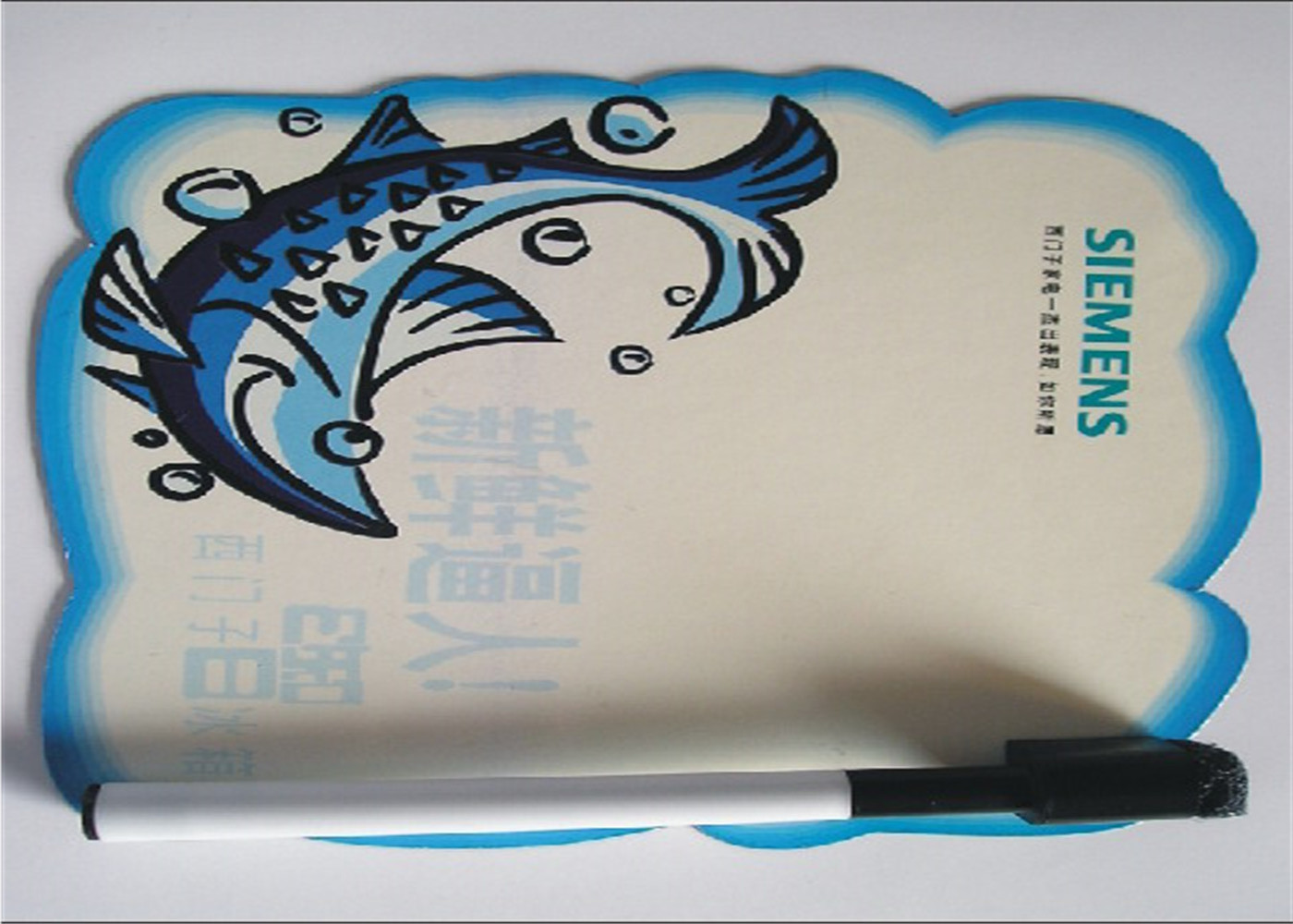 4)磁性留言板白板:软胶磁铁(或硬纸板)+在涂层纸上四色打印裱光膜+可擦笔
