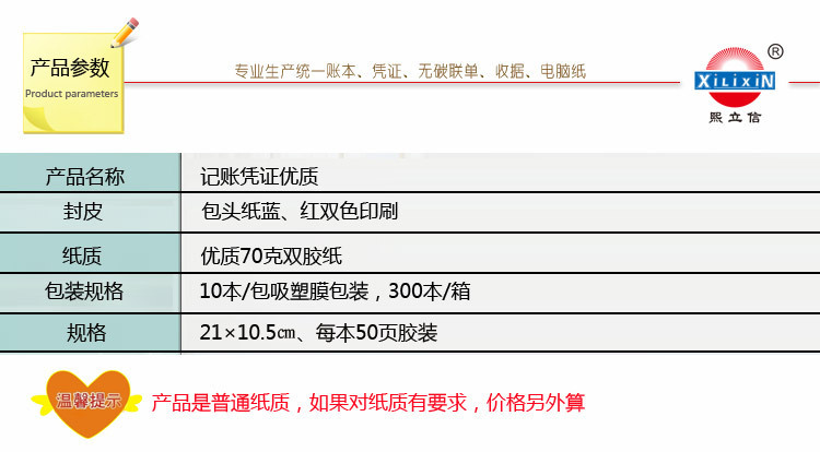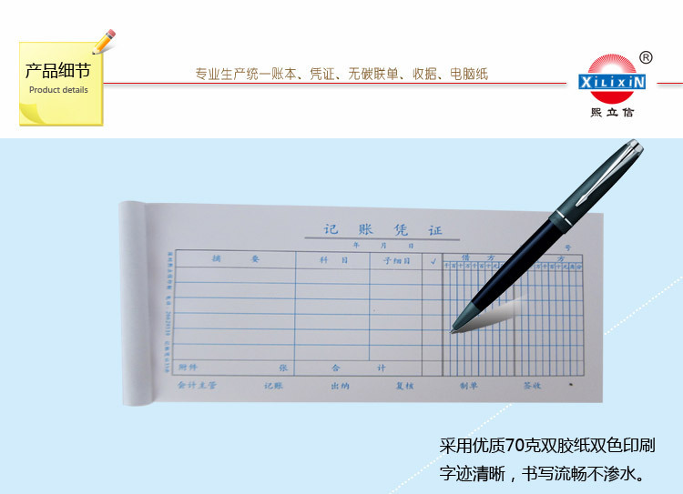 深圳市熙立信办公用品有限公司源自深圳市立信会计用品印刷有限公司,企业在承袭立信公司精神上的基石上不停发展壮大。它是一家集设计,印刷和销售为一体的专业会计用品公司。专业生产深圳市和广州市财政局制作的“统一分类帐,凭证,声明”系列;“熙立信”自主品牌联丹系列,会计表单系列,微电脑打印纸系列产品;印刷获得政府部门认可国内外规范信封资质。为全国文具行业的批发商和零售商提供会计用品系列产品的批发代理服务。