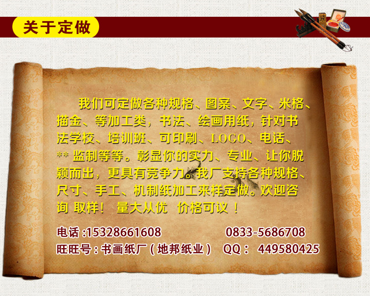 夹江县地邦书画纸厂是一家专业生产和加工书画纸,宣纸,毛边纸,土纸,彩色轩,万年红,粉彩玫瑰,米格纸,安装材质等的公司。科学的质量管理体系。夹江县地邦书画纸厂的诚信,实力和产品质量获得业界的认可。欢迎各界朋友光临,指导和洽商业务。