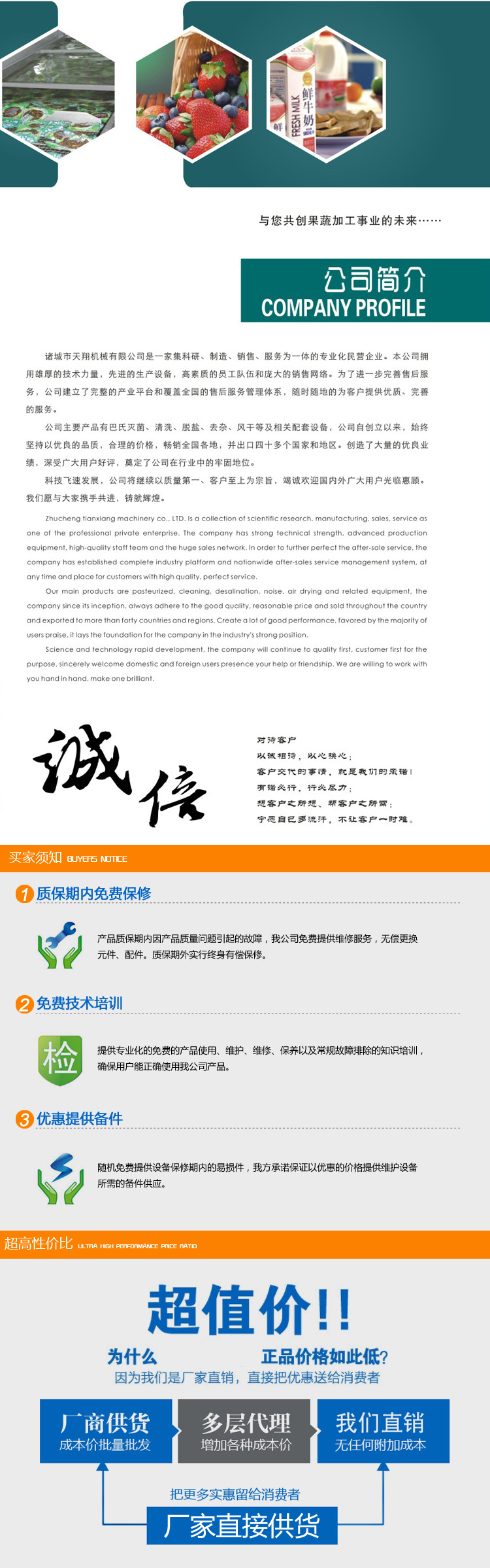 诸城市天翔机械有限公司坐落中国龙城,即“舜帝故里山东诸城市”,是国内生产蔬菜清洗机,全自动油炸机,高压强流风干机,巴氏杀菌设备系列,捏合机系列主干企业,风干系列,咸菜淡化生产线系列。目前,已形成集科研开发,生产,销售于一体的综合性企业。我公司研发并投放市场的产品已达到国内领先水准,全然替代了国内同类进口产品。 天翔公司以其科学的管理体系,高质量的产品,不错的销售和全过程的技术服务在同行业中别具一格,并受到了全国客户的普遍好评。我们立足高起点,大投入,高水准的运营,坚称高标准,零缺陷,求精,抓住每一个发展环节,奋斗制作“天翔”品牌。 天翔公司希望与客户开展长期友善的合作,并从满足客户需要的视角寻求实现双方共赢的发展。我们将秉承“寻求合作,有助于发展”的企业主旨,本着互惠互利,联合发展的规范,与您携手共创辉煌的明天。