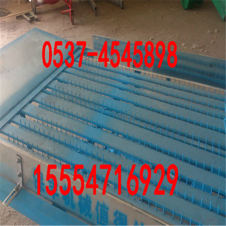 草帘机,包括框架,电机,送料杆,针,其特点是:电机和减速器安装在机架的底部,皮带轮安装在减速器的轴上。它通过皮带条和凸轮轴上的皮带轮相连接;b,凸轮轴上框架的两侧均安装有对称凸轮,并且在凸轮上处置了凸轮槽。安装在框架上的杠杆的一端连接到凸轮槽活动,另一端与导向杆可滑动地连接;c。导向杆可移动地安装在导轨中,对称地坐落机架的两侧,两个导向杆均装有针板,针板对称固定有针座,有线针安装在针座中;d,机架还装备有齿轮轴和两个前后优先轮。安 在齿轮轴上配有链轮和锥齿轮。两个优先轮在每个端部都装设有链轮和优先轮,凸轮轴上的链轮,齿轮轴上的链轮和首选轴上的轮通过链条连接,而两个链轮都链轮优选的轴通过链条连接;e。齿轮轴上的锥齿轮与另一个锥齿轮啮合。锥齿轮穿越轴和凸轮连接,凸轮用凸轮槽处置;f。梭 体安装在框架和每个行计数器上,往复设备安装在往复设备主体中,齿轮固定在往复设备下方。齿条啮合,机架的一端可移动地安装在凸轮凸轮槽内;g。四个优先轮有一个优先套,优先套配有托杆槽,两个支撑杆放在同轴的支架槽中。h。支架固定在与每个梭子主体相对应的框架上。支架的两侧都有送料杆,前后支架上都安装了送料杆,并且在上面有拨料杆。