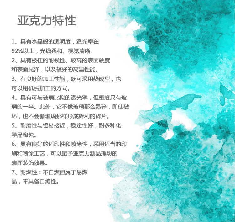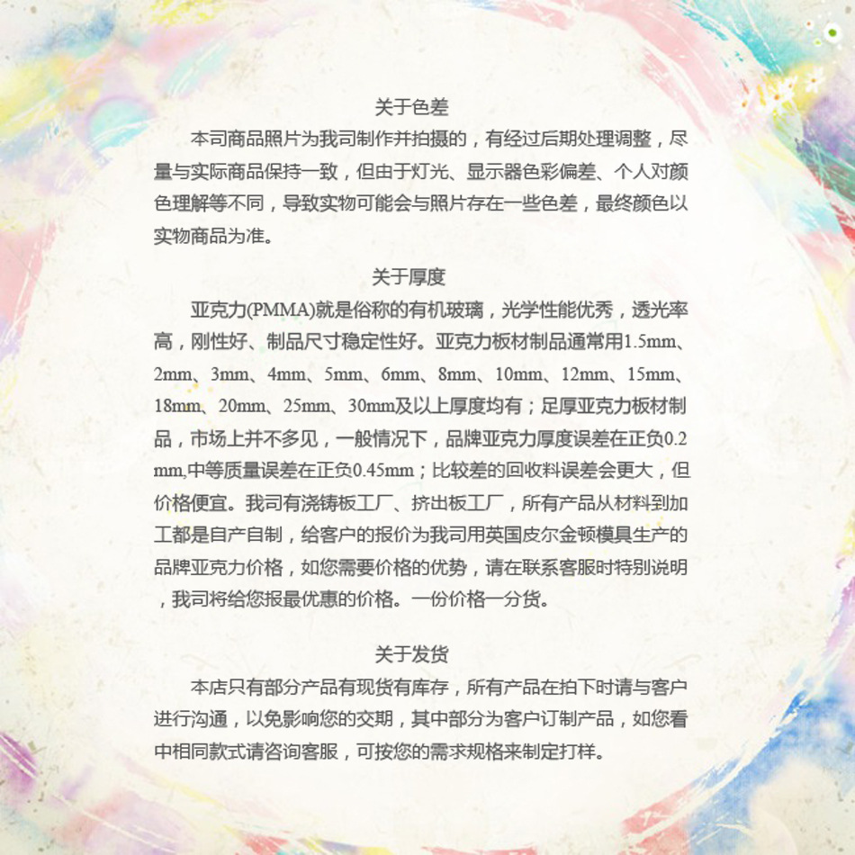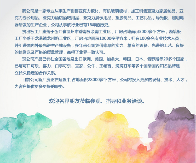 可以生产有机玻璃/彩会板开口,抛光,热弯,粘接,成型,雕刻,激光(激光)切割,注塑,喷砂,丝印,uvprinting,亚克力printing等。亚克力家居用品,亚克力办公用品,亚克力酒吧酒吧用品,亚克力展示用品@@@,pvc制品。专业生产亚克力板,pet制品片材,pvc卷材,酒盒,化妆品盒,pet展示架,广告牌,徽章,葡萄酒品牌,黑板,led展示架,POP广告牌,亚克力汽车日夜两用防眩镜,PVC放大镜,亚克力放大镜等为客户提供更好的服务。